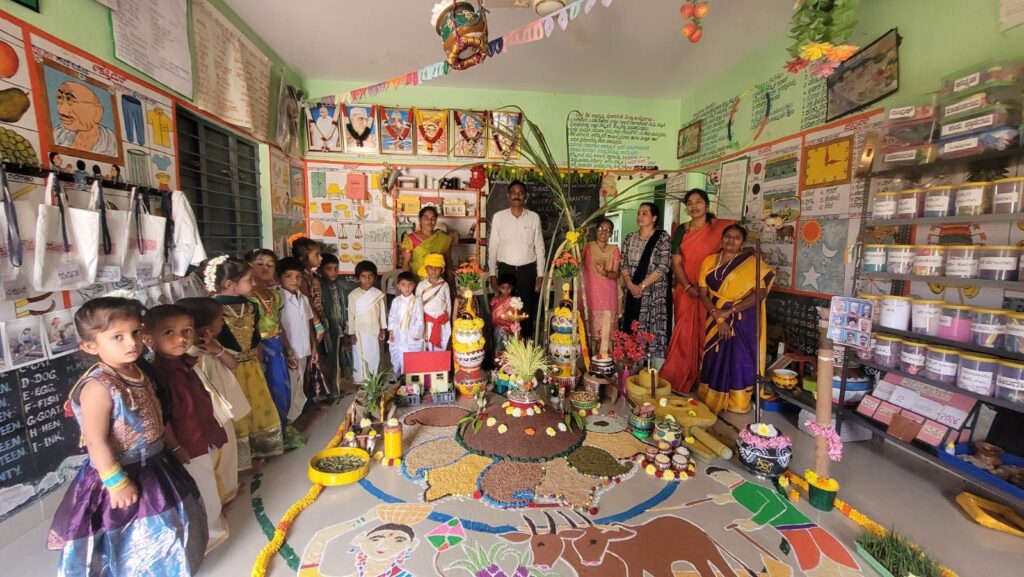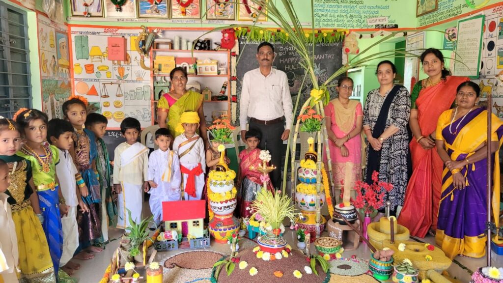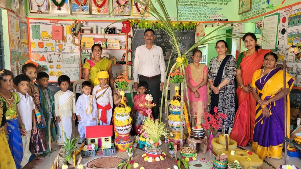 ಸಂಕ್ರಾಂತಿ ಹಬ್ಬದ ಹಿನ್ನಲೆಯಲ್ಲಿ ಅಂಗನವಾಡಿ ಯಲ್ಲಿ ಹಳ್ಳಿಗಳಲ್ಲಿ ಬಳಸುತ್ತಿದ್ದಂತಹ ವಸ್ತುಗಳನ್ನು ಇಟ್ಟು ಆ ಮಕ್ಕಳಿಗೆ ಅದರ ಮಾಹಿತಿ ಸಂಕ್ರಾಂತಿ ಹಬ್ಬದ ವಿಶೇಷತೆಯ ಬಗ್ಗೆ ಇಲ್ಲಿನ ಶಿಕ್ಷಕಿ ಜಾನಕಮ್ಮ ಬಹಳ ವಿಶೇಷವಾಗಿ ತಿಳಿಸಿಕೊಟ್ಟಿದ್ದಾರೆ.